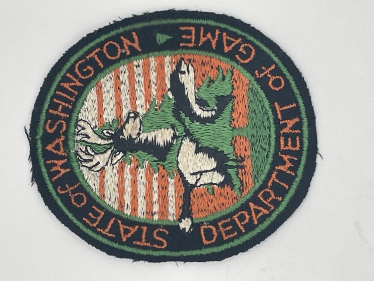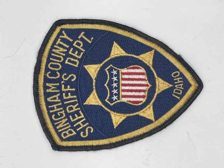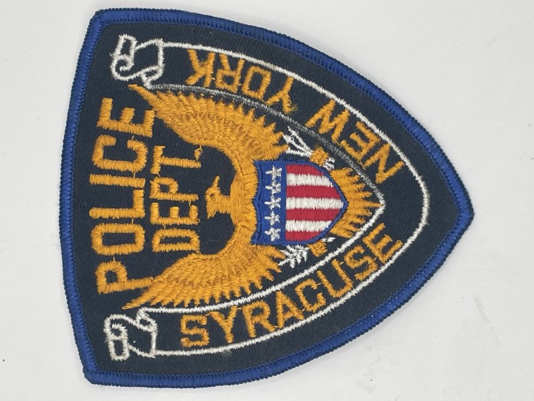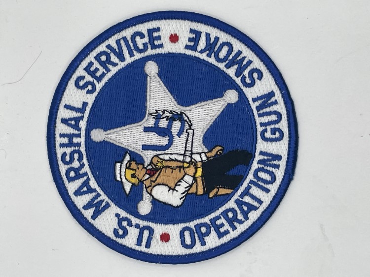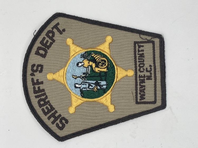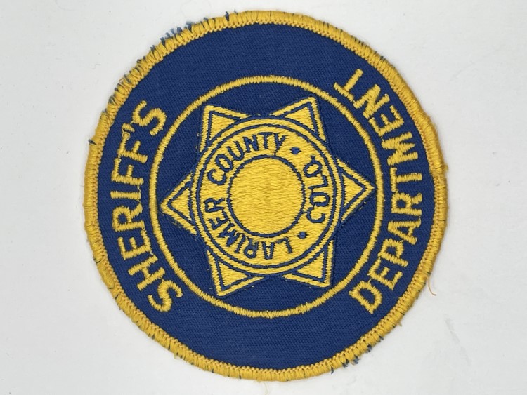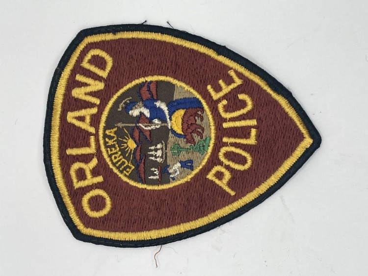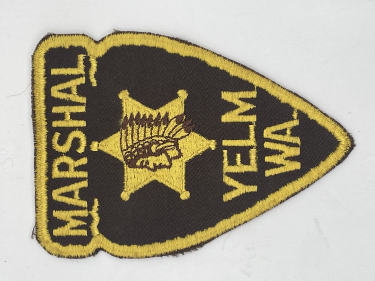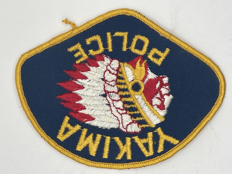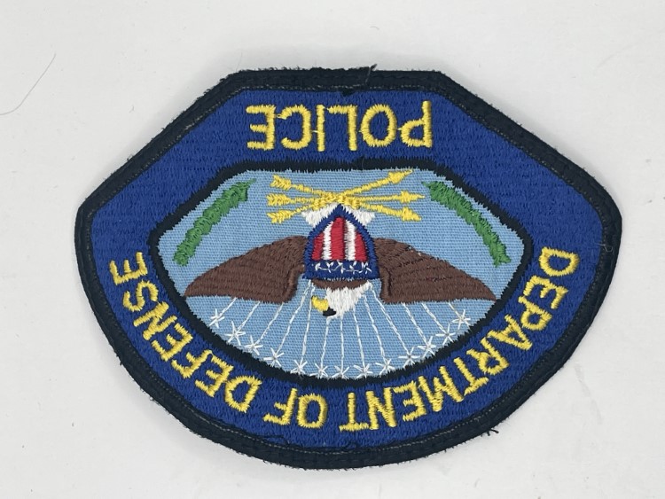 Tan arm patch with yellow circle and blue and white text