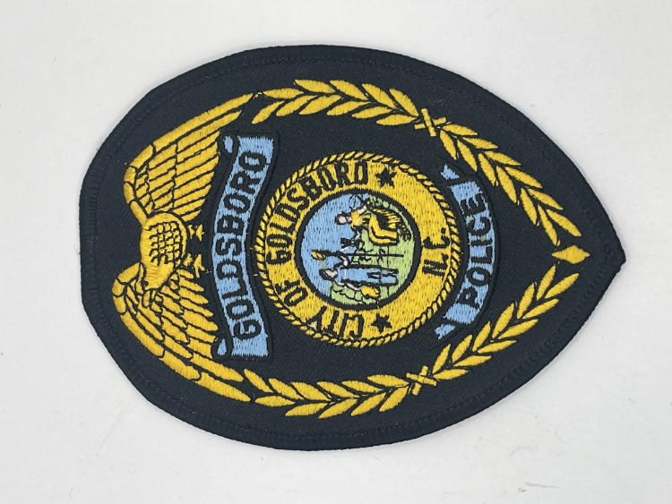 Black oval patch with gold trim and text